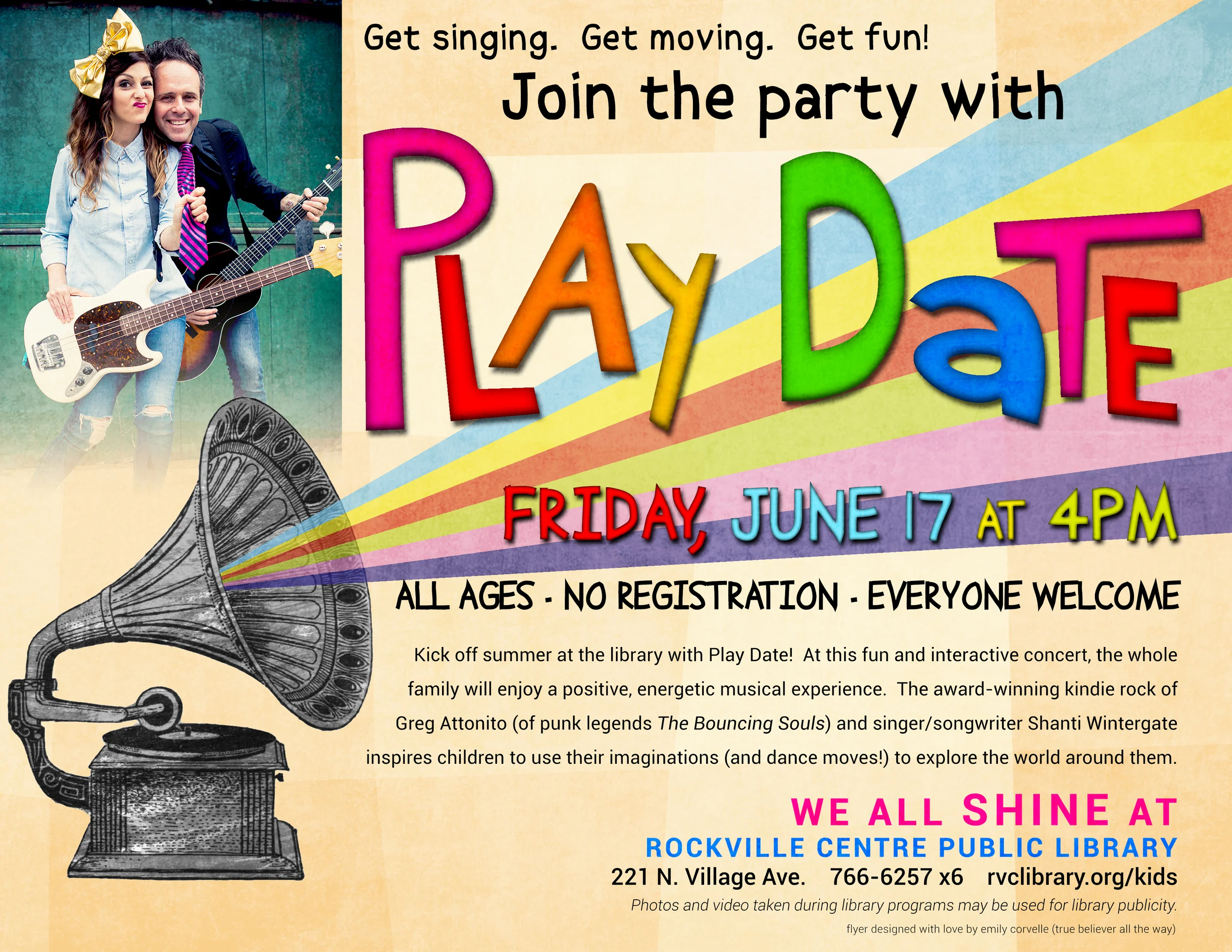 Join husband and wife duo Greg Attonito and Shanti Wintergate of the award-winning kindie music group, Play Date. Their music inspires children to use their imaginations—and their dance moves—to rock out and explore the world around them! Play Date's albums have won Parents' Choice Awards, NAPPA Awards and Creative Child's Seal of Excellence Award among others. "There's always been a strong sense of self-discovery and independence in good kids' music,” said NPR’s Stefan Shepherd, “and…[Play Date] has it all." Play Date's live, interactive show is a great place for families to share a positive, energetic and memorable music experience together.